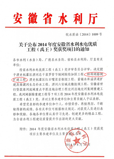 近日,經(jīng)安徽省水利水電優(yōu)質(zhì)工程(禹王)獎評審委員會(huì )評審,由安徽水利股份水利分公司承建的蚌埠閘船閘擴建工程,被授予2014年度安徽省水利水電優(yōu)質(zhì)工程(禹王)獎。