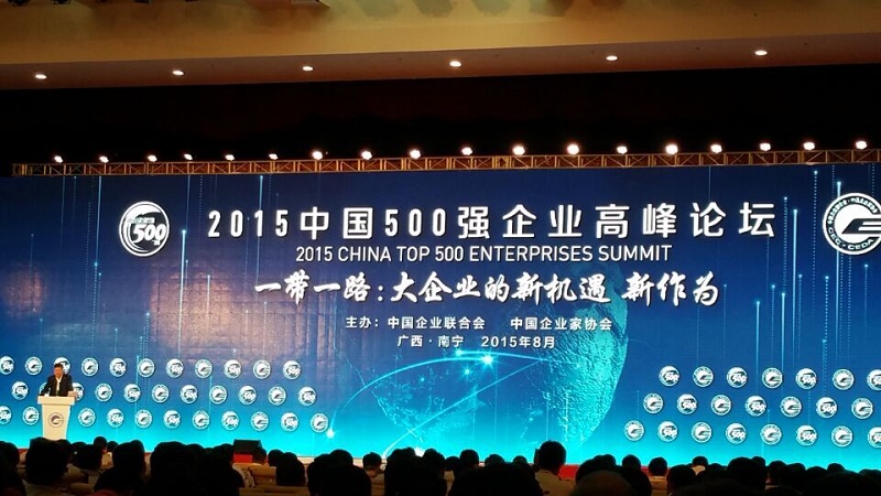 2015年8月21日至23日,中國企業(yè)聯(lián)合會(huì )在廣西南寧召開(kāi)“2015中國500強企業(yè)高峰論壇”。第十屆全國政協(xié)副主席、中國企業(yè)聯(lián)合會(huì )會(huì )長(cháng)王忠禹、廣西壯族自治區黨委書(shū)記、自治區人大常委會(huì )主任彭清華、廣西壯族自治區主席陳武、國務(wù)院國資委副主任劉強、工業(yè)和信息化部副部長(cháng)辛國斌、韓國新萬(wàn)金開(kāi)發(fā)廳廳長(cháng)李秉國到會(huì )并講話(huà), 會(huì )議發(fā)布了2015中國企業(yè)500強、中國制造業(yè)企業(yè)500強、中國服務(wù)業(yè)企業(yè)500強、中國跨國公司100大榜單。