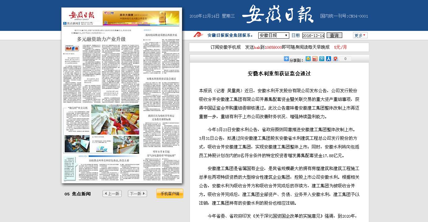 安徽日報和安徽省人民政府網(wǎng)站專(zhuān)題報道集團重大資產(chǎn)重組事項