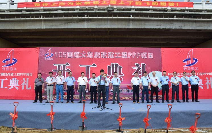 7月8日,105國道太湖段改建工程PPP項目舉行隆重開(kāi)工儀式,太湖縣委縣政府領(lǐng)導與安徽建工集團有限公司領(lǐng)導共同出席開(kāi)工典禮。集團公司副總經(jīng)理王厚良,安建投資公司總經(jīng)理、黨總支副書(shū)記朱忠明,安徽路港公司董事長(cháng)、總經(jīng)理李振標等分別致辭,太湖縣委書(shū)記程志翔宣布項目正式開(kāi)工。太湖縣交通運輸局、縣公路局、縣指揮部、安建投資公司、施工單位、監理單位、沿線(xiàn)各鄉鎮代表等200余人參加此次典禮。