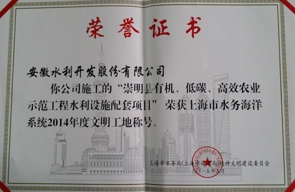 近期,安徽水利上海分公司承建的崇明縣有機、低碳、高效農業(yè)示范工程水利設施配套項目在施工過(guò)程中精心組織,科學(xué)管理,積極實(shí)施安全標準化和文明施工,屢次受業(yè)主單位好評,并被上海市水務(wù)局精神文明建設委員會(huì )授予“上海市水務(wù)海洋系統文明工地”榮譽(yù)稱(chēng)號。